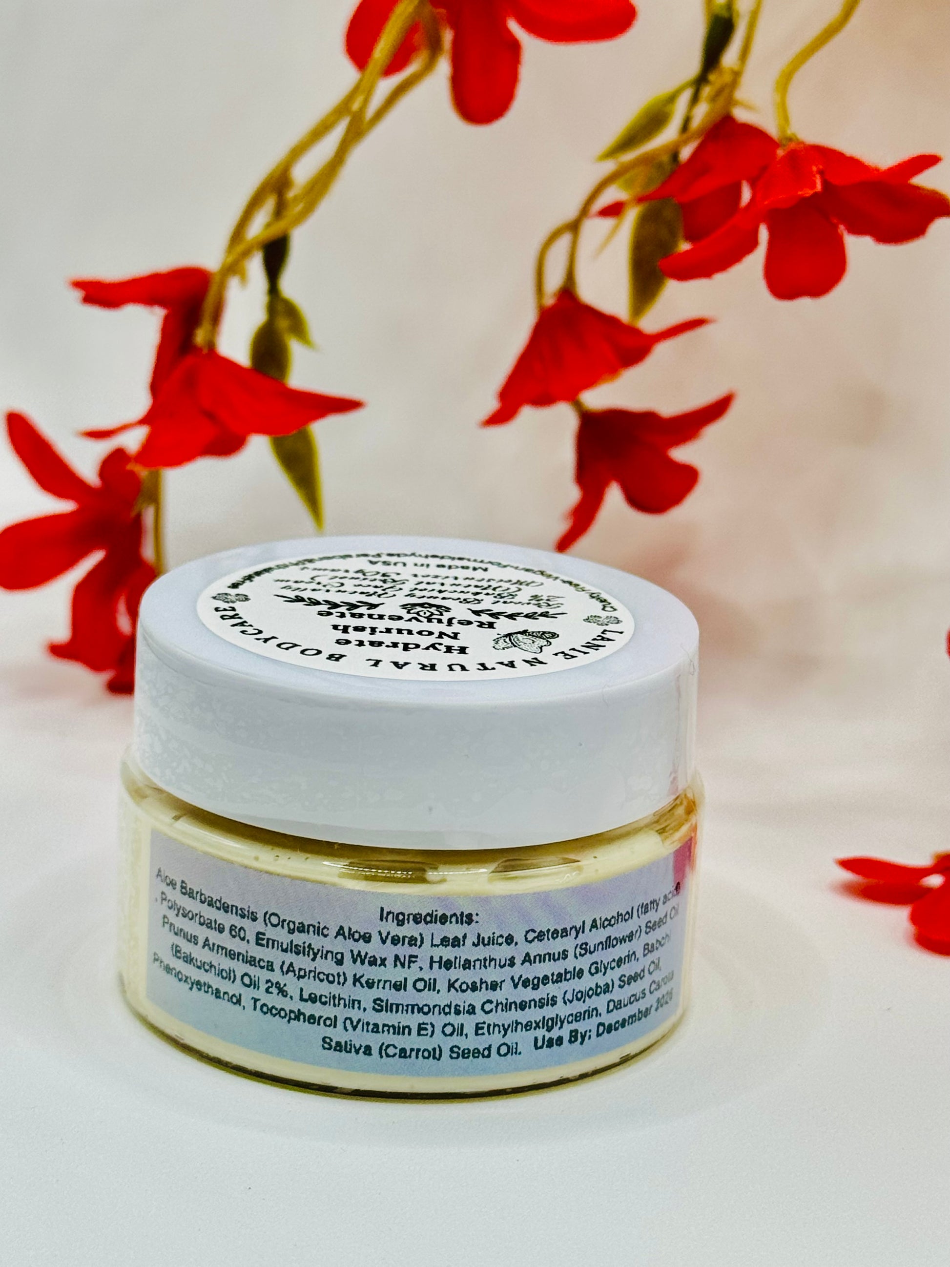 Aloe Barbadensis (Organic Aloe Vera) Leaf Juice, Cetearyl Alcohol (fatty acid), Polysorbate 60, Emulsifying Wax NF, Helianthus Annus (Sunflower) Seed Oil, Prunus Armeniaca (Apricot) Kernel Oil, Kosher Vegetable Glycerin, Babchi (Bakuchiol) Oil, Lecithin, Simmondsia Chinensis (Jojoba) Seed Oil, Phenoxyethanol, Tocopherol (Vitamin E) Oil, Ethylhexlglycerin, Daucus Carota Sativa (Carrot) Seed Oil.