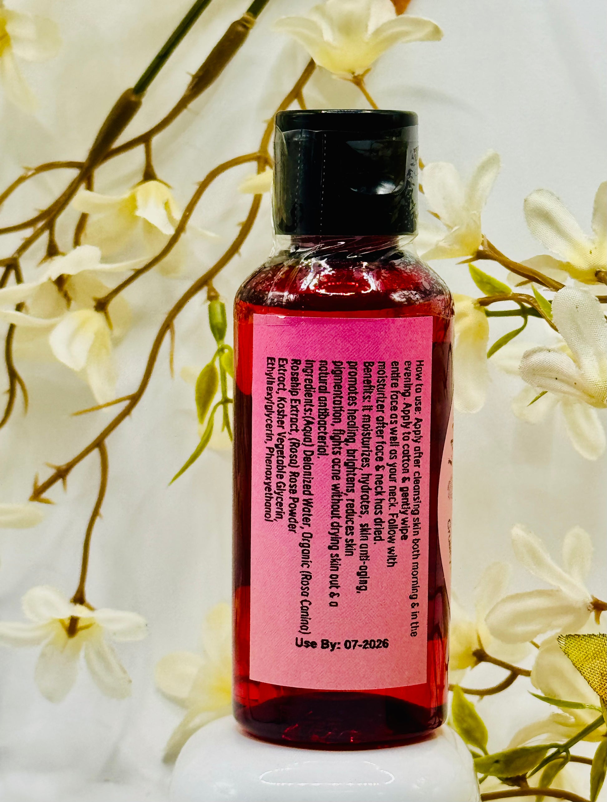 Aqua) Deionized Water, Organic (Rosa Canina) Rosehip Extract, (Rosa) Rose Powder Extract, Koser Vegetable Glycerin, Ethylhexylglycerin, Phenoxyethanol.